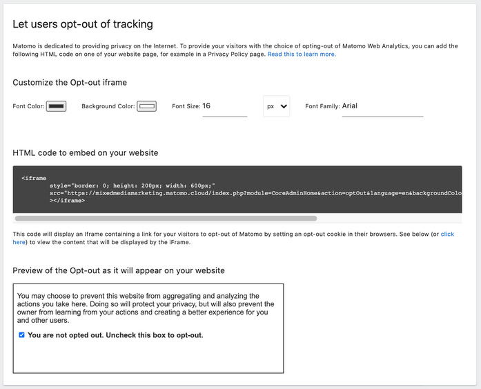 同意が義務付けられていない地域では、Matomoのオプトアウトフォームを埋め込み、訪問者が追跡から除外されるようにできます。